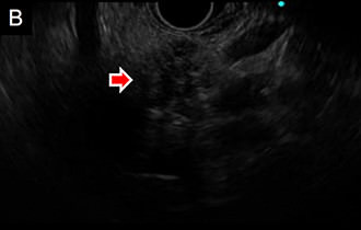 A. 膵癌を疑う病変を認め、針生検を行い確診を得ました (↓)。