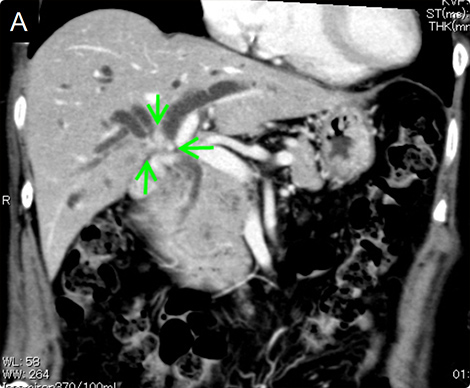A.入院時造影CTで右胆管優位の肝門部胆管癌を認めました(矢印)。