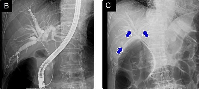 B.C.左胆管のドレナージのみでは減黄できなかったため、3本の内視鏡的胆管ドレナージ(ERBD)を挿入しました(矢印)。