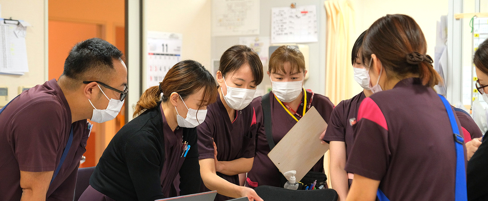 救急や急性期においては、状態の変化を見極め適切な処置を行うことによって地域住民のいのちを守るとともに身体的・精神的な回復を促し、少しでも早く住み慣れた生活の場に戻ることができるような支援を行っています。また、継続した療養を必要とされる場合には、各施設や地域と連携しながらその人らしい生活ができるよう患者さんの生活に視点をおいて患者さんとともに考え行動し、看護の専門職業人としての真価を発揮して、質の高い信頼される看護サービスの提供を目指しています。
