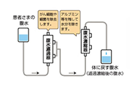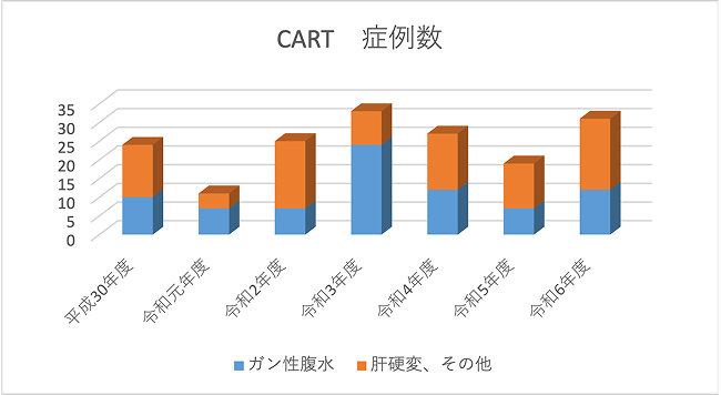 CARTとは、「Cell free and Concentrated Ascites Reinfsion Therapy」の略称であり、腹水症(胸水症を含む)患者の腹水(または胸水)を採取し、それを濾過、濃縮して、患者に再静注する治療法です。