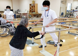 現在緩和ケア病棟にご入院の患者様にも、状態にあった訓練を選択しリハビリテーションの介入を行っています。リハビリテーション室まで来れない患者様には病室にお伺いしベッドサイドにてマッサージ等を行ったり、体力のあられる方には歩行訓練や動作訓練など行っています。