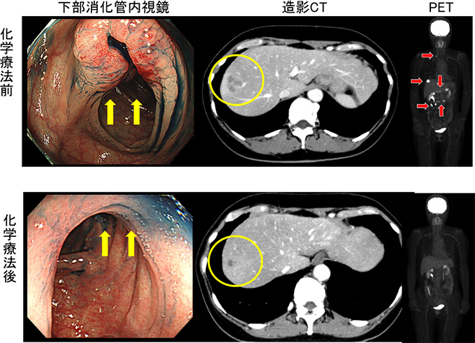 56歳女性。横行結腸癌同時性肝転移(肝S8)+傍大動脈リンパ節転移を認め当センターへ紹介となりました。B-mab+XELOX 3コース施行で著効を示し、PETでもnear