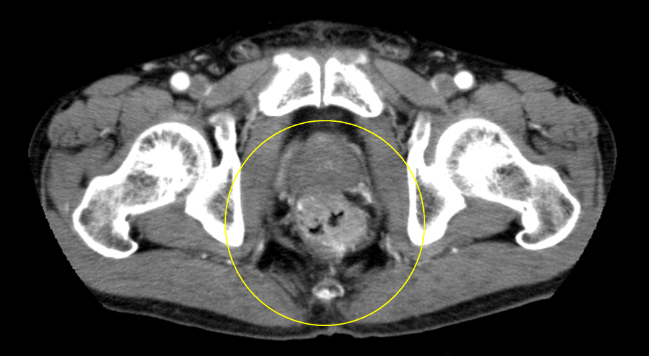 - 67歳男性。肛門痛を主訴に近医受診し直腸診で直腸癌を疑われ当センターへ紹介となりました。直腸病変は、肛門縁から約1cmに半周性の2型病変を認めた(図1, 2)。他に、S状結腸にも全周性の病変を認めました(図3)。腹腔鏡下に腹会陰式直腸切断術と両側側方リンパ節郭清を施行しました(図4)。