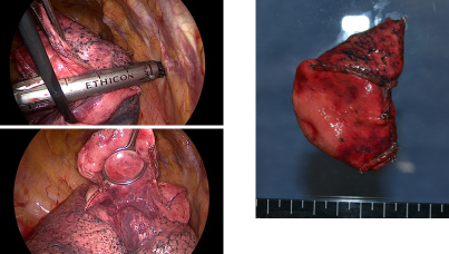 左が胸腔鏡所見、右が切除標本を示す。3回の手術の術中出血量はすべて100ml以下でした。