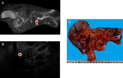 A.MRIによる膵管造影、B.内視鏡エコーによる膵腫瘍像、C.切除標本