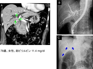 治療経過と総ビリルビン値の推移を示します。内視鏡的ドレナージにより速やかに減黄しました。