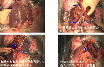 右肝切除+尾状葉全切除+肝外胆管切除・リンパ節郭清+胆管空調吻合を行いました(手術時間8時間40分、出血量700g、無輸血)。組織学的な治癒切除が得られました。