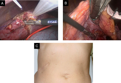 A.腹腔鏡肝切除の術中写真、B.腹腔鏡膵切除の術中写真、C.完全腹腔鏡下肝切除の術創