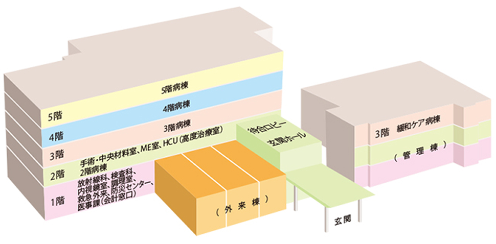 - 1階 放射線科、検査科、内視鏡室、調理室、救急外来、防災センター、医事課(会計窓口)