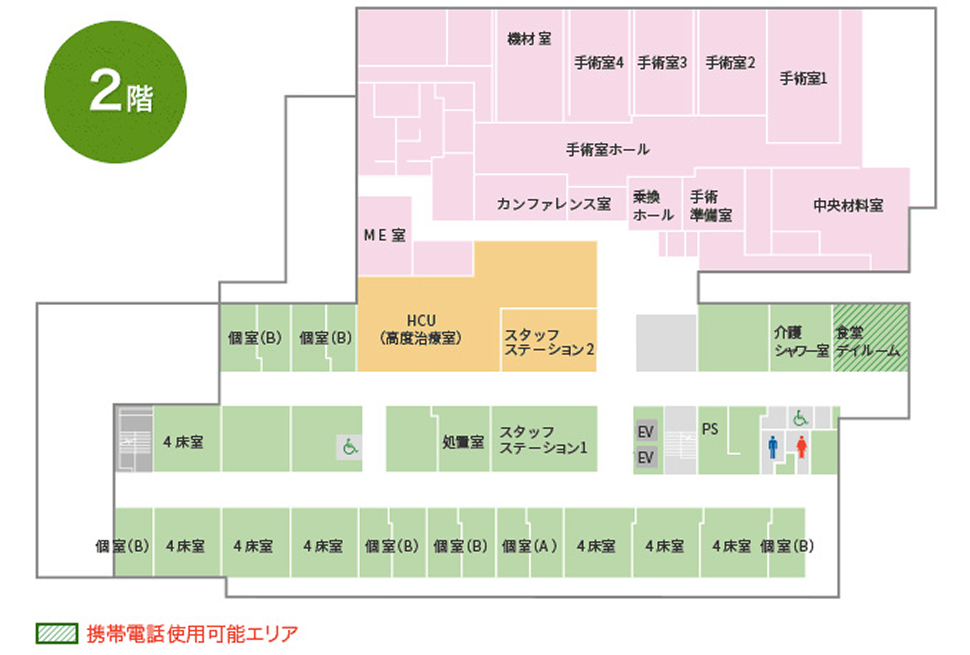 - 2階 外科、手術・中央材料室、ME室、HCU(高度治療室)