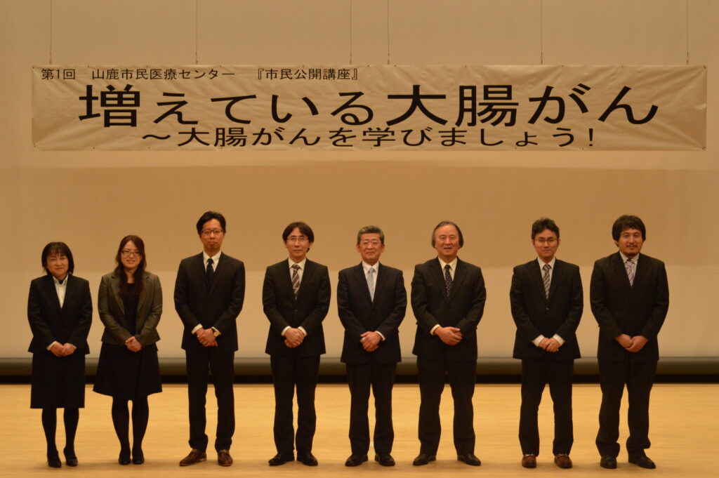 山鹿市民医療センター主催の第一回市民公開講座『増えている大腸がんー大腸がんを学びましょう!』が無事に終了しました。土曜日にも関わらず205名の参加をいただき、心より感謝しています(写真1)。山鹿市民医療センターのスタッフに加えて、山鹿市健康増進課の園田洋子様、熊本大学付属病院外来化学療法センター長の陶山浩一先生、熊本大学消化器外科の坂本快郎先生、にご講演いただきました(写真2)。講演会終了後の相談(質問)コーナーでも、活発な質疑応答がなされました(写真3)。当日のまとめを示させていただきます()。大腸がんの予防、早期発見・早期治療、チーム医療、集学的治療などがキーワードです。