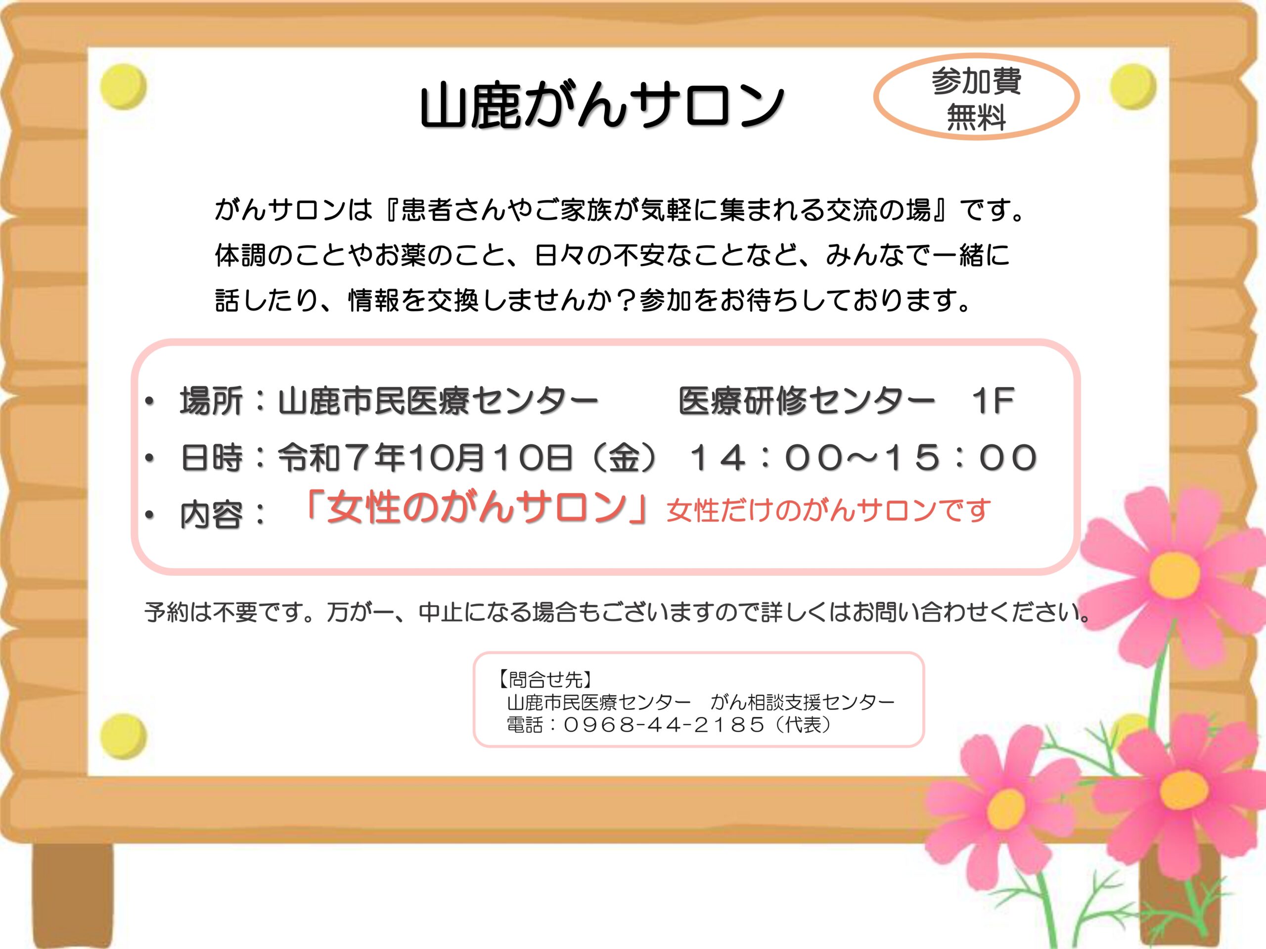 2025/09/12 がんサロン 10月開催のお知らせ がんサロン 10月開催のお知らせ 場所:山鹿市民医療センター 医療研修センター 1F日時:令和7年10月10日(金) 午後2時00分~午後3時00分 【内容】 ・「女性のがんサロン」 ※ 女性だけのがんサロンです。 【参加費】 ・無料 【申込方法】 ・ご予約等は必要ございません。当日のご参加お待ちしております。 ご不明な点がございましたら下記までお問合せください。 【問合せ先】 ・山鹿市民医療センター がん相談支援センター 0968-44-2185 ページ送り お知らせ一覧 前の記事 次の記事へ