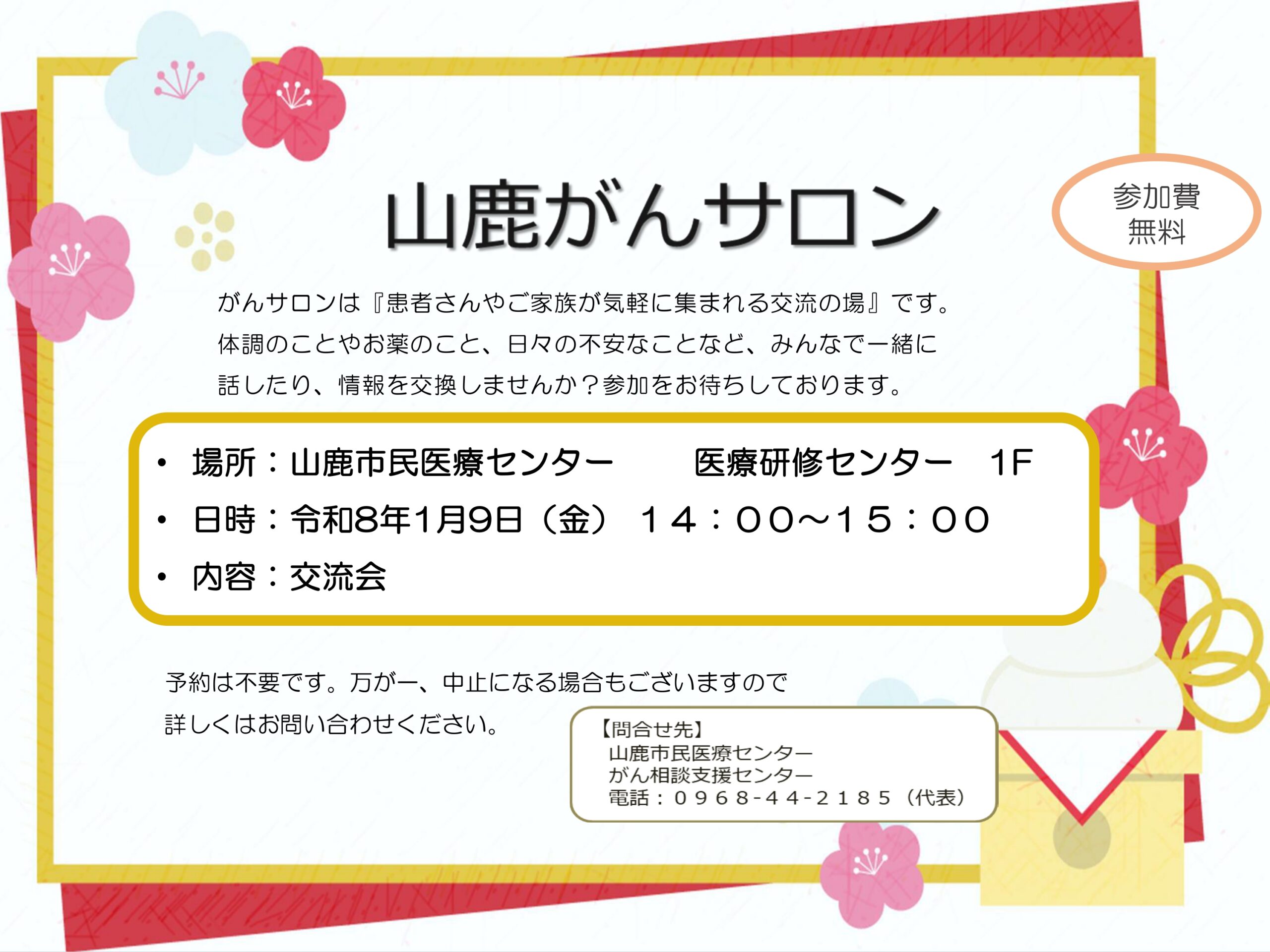 2025/12/12 がんサロン 1月開催のお知らせ がんサロン 1月開催のお知らせ 場所:山鹿市民医療センター 医療研修センター 1F日時:令和8年1月9日(金) 午後2時00分~午後3時00分 【内容】 ・交流会 【参加費】 ・無料 【申込方法】 ・ご予約等は必要ございません。当日のご参加お待ちしております。 ご不明な点がございましたら下記までお問合せください。 【問合せ先】 ・山鹿市民医療センター がん相談支援センター 0968-44-2185 ページ送り お知らせ一覧 前の記事 次の記事へ