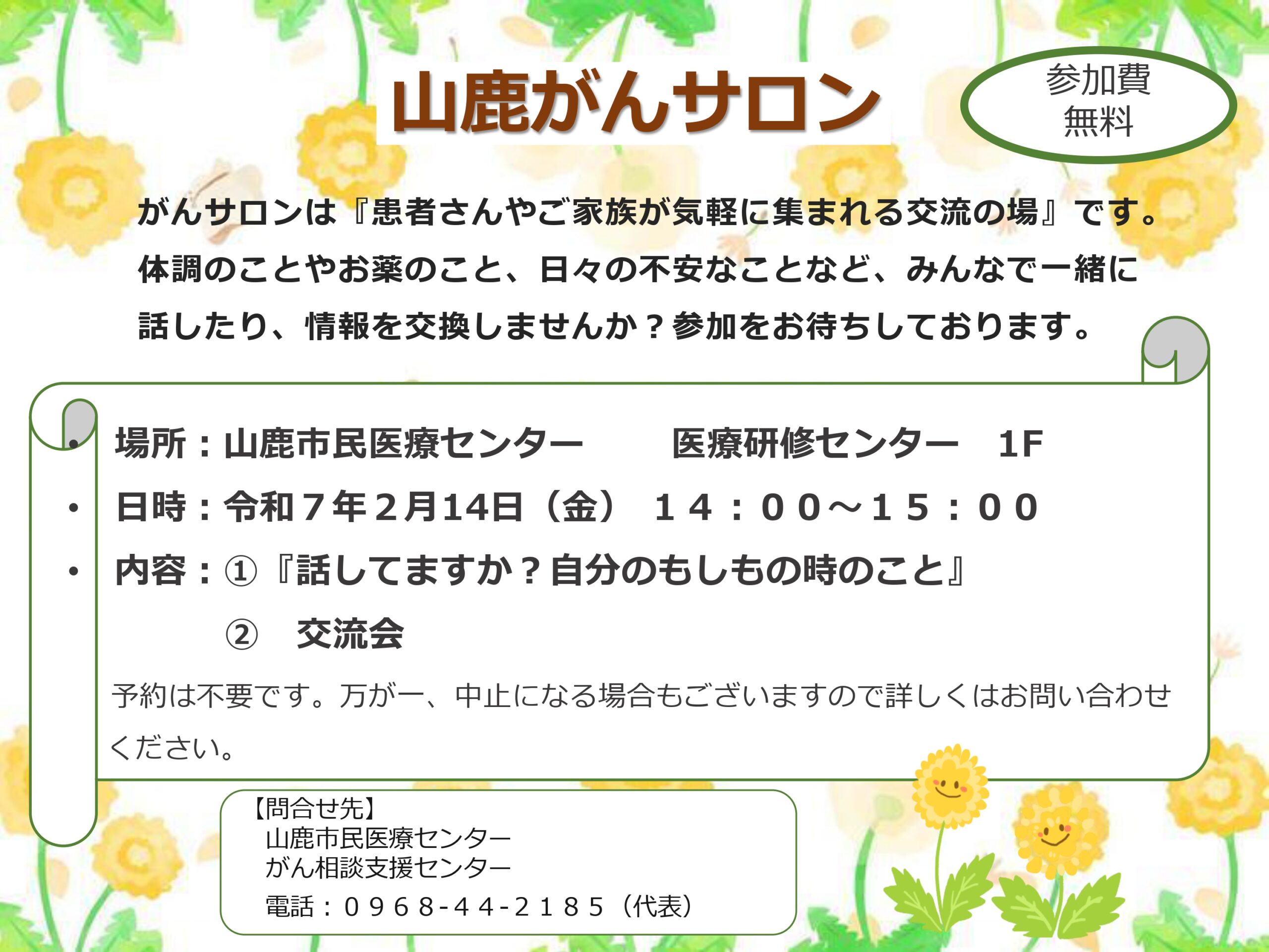 2025/01/14 がんサロン 2月開催のお知らせ がんサロン 2月開催のお知らせ 場所:山鹿市民医療センター 医療研修センター(1F) 日時:令和7年2月14日(金) 午後2時00分~午後3時00分 【内容】 ・交流会 【参加費】 ・無料 【申込方法】 ・ご予約等は必要ございません。当日のご参加お待ちしております。 ご不明な点がございましたら下記までお問合せください。 【問合せ先】山鹿市民医療センター がん相談支援センター 0968-44-2185 ページ送り お知らせ一覧 前の記事 次の記事へ