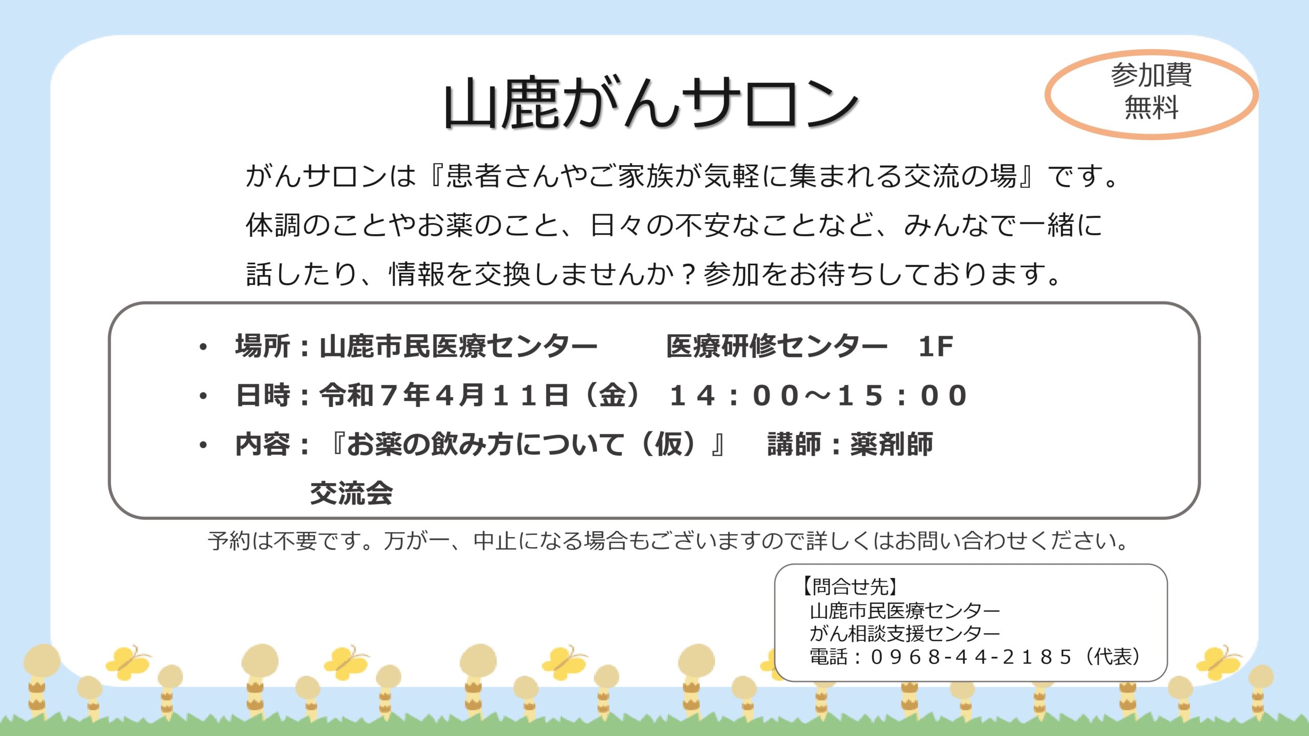 2025/03/18 がんサロン 4月開催のお知らせ がんサロン 4月開催のお知らせ 場所:山鹿市民医療センター 医療研修センター(1F) 日時:令和7年4月11日(金) 午後2時00分~午後3時00分 【内容】 ・『お薬の飲み方について』 ・交流会 【参加費】 ・無料 【申込方法】 ・ご予約等は必要ございません。当日のご参加お待ちしております。 ご不明な点がございましたら下記までお問合せください。 【問合せ先】山鹿市民医療センター がん相談支援センター 0968-44-2185 ページ送り お知らせ一覧 前の記事 次の記事へ