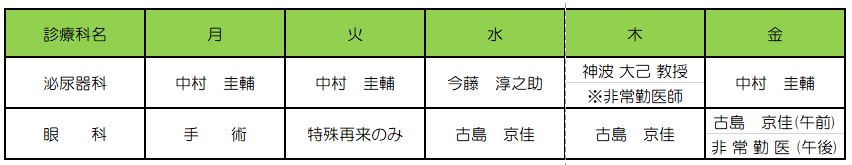 2025/04/02 常勤医(泌尿器科・眼科)外来開設のお知らせ これまで泌尿器科と眼科では非常勤医のみで対応してまいりましたが、このたび常勤医が着任いたしました。 これにより、より一貫性のある診療と患者さんへのサポートをお届けできる体制が整いました。今後ともよろしくお願いいたします。 外来担当医表 ページ送り お知らせ一覧 前の記事 次の記事へ