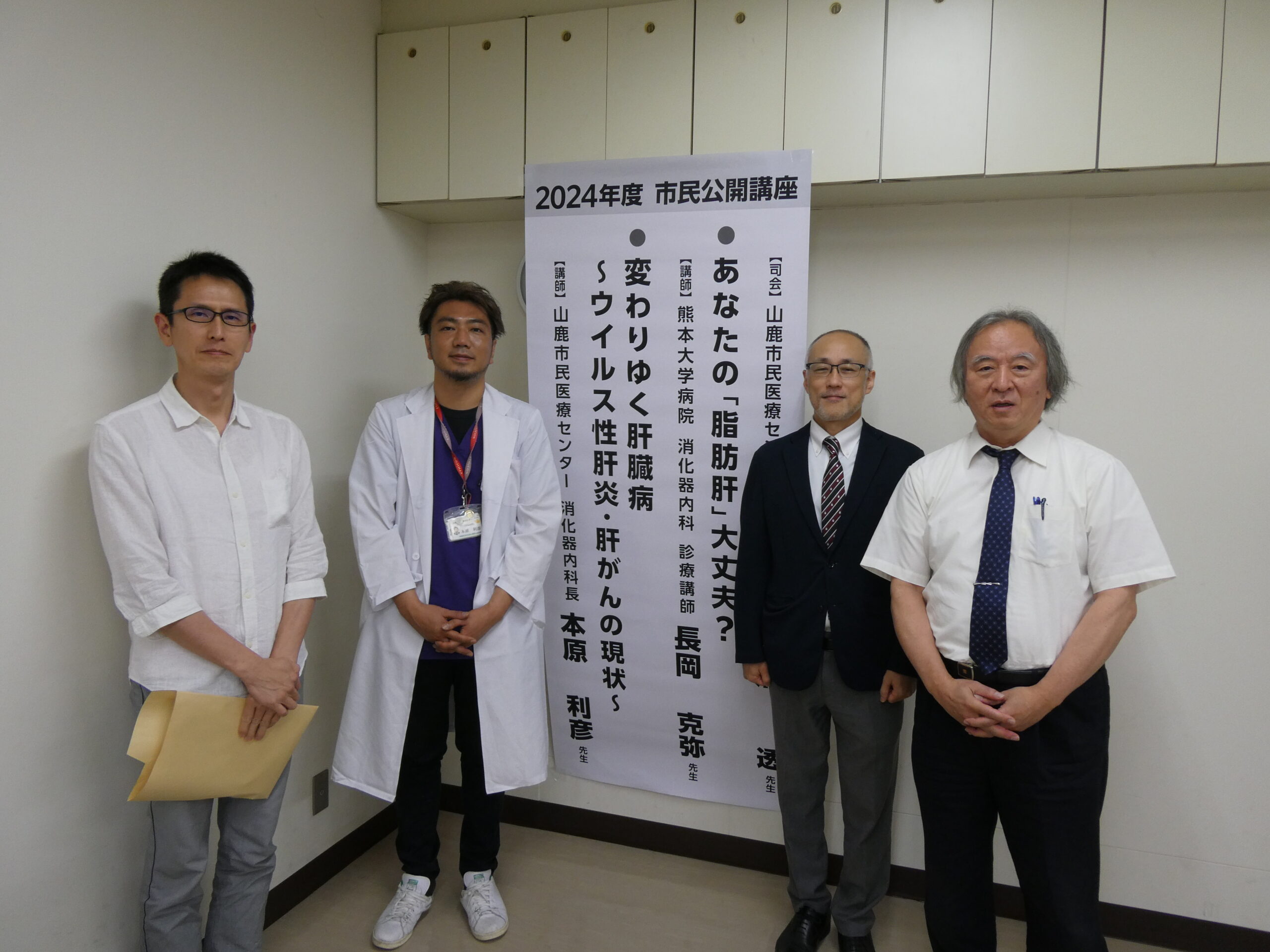 このイベントは、山鹿市を含む県内6ヵ所で同日・同時刻に講演しており、今年のテーマは“元気な肝臓で目指せ健康寿命!”で、司会に当センターの別府 透先生、講師に熊本大学・消化器内科の長岡 克弥先生と私、本原で講演させていただきました。